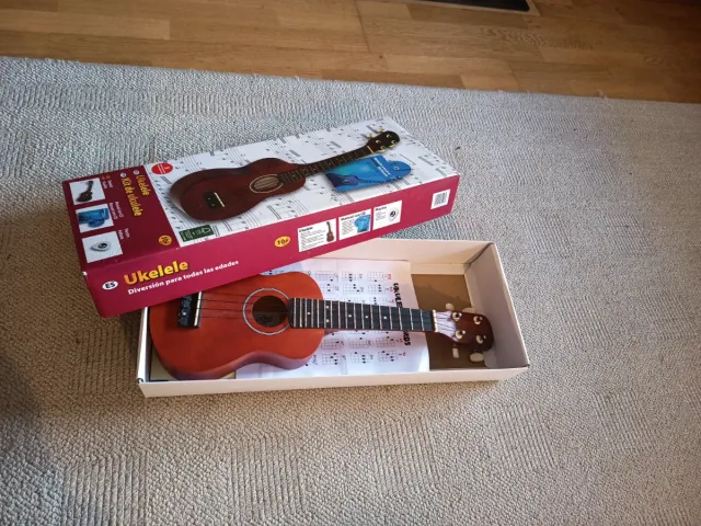 Ukelele de madera en color marrón, ideal para iniciarse en la música. Viene en su caja original.