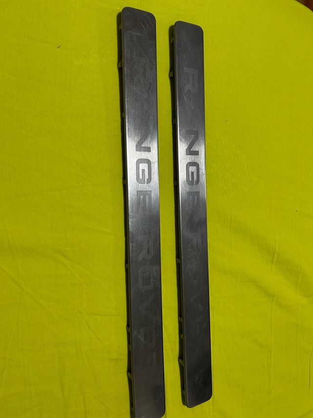 Umbrales delanteros para Range Rover Evoque. Piezas de metal con el logo grabado. Originales. - Set de dos umbrales delanteros. - Logo 'RANGE ROVER' grabado.