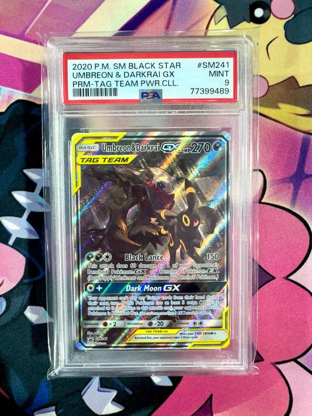 Detalles del productoEspectacular carta Pokémon Umbreon & Darkrai GX de la colección Black Star de 2020, en perfecto estado. Calificación PSA 9.