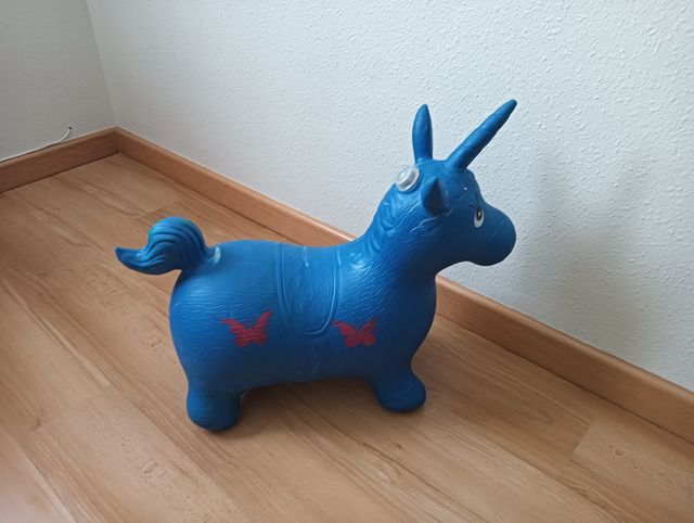 Un divertido unicornio inflable de color azul, perfecto para jugar. - Diseño con mariposas rojas. - Incluye válvula para inflar.