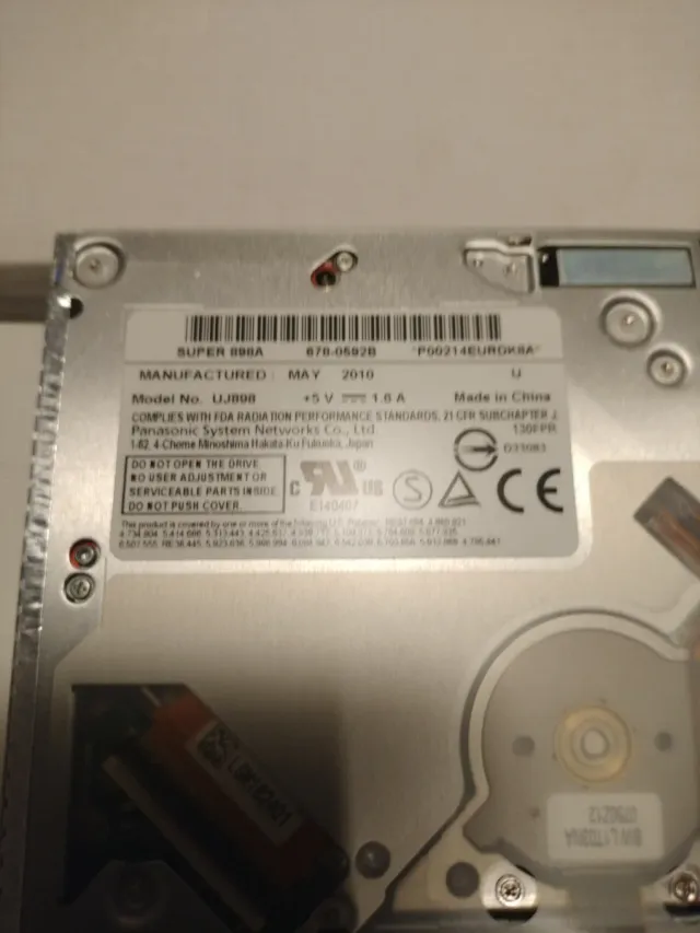 Unidad DVD para MacBook Pro modelo 2010. Cuando lo quité funcionaba - Modelo: UJ-898 - Fabricada en Mayo de 2010 - Voltaje: +5V, 1.6A - Fabricada en China