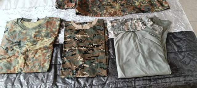 Talla pantalón L, chaqueta L, camisetas: marpat M, camuflaje normal L, manga larga con refuerzos y bolsillos XS, talla grande, como una M.