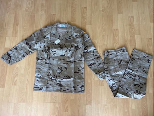 Detalles del productoConjunto de uniforme militar en camuflaje árido pixelado.