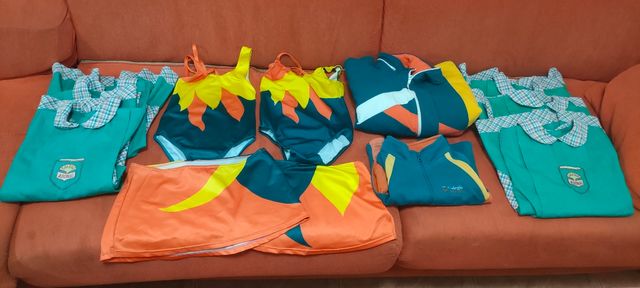 Detalles del productoUn chaquetón T-6 a 10€, una chaqueta de chándal T-2 a 5 €, dos babys T-4 a 10€ cada uno, cuatro babys T-2 a 10€ cada uno, una malla de gimnasia rítmica T-4 con su faldita y otra T-6 a 10€ cada una.