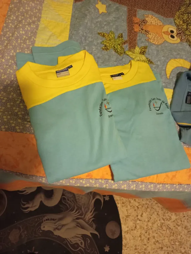 Dos camisetas de uniforme de la Fundación San Juan de Ávila. - Color amarillo y turquesa. - Diseño con logo de la fundación. - Talla 16