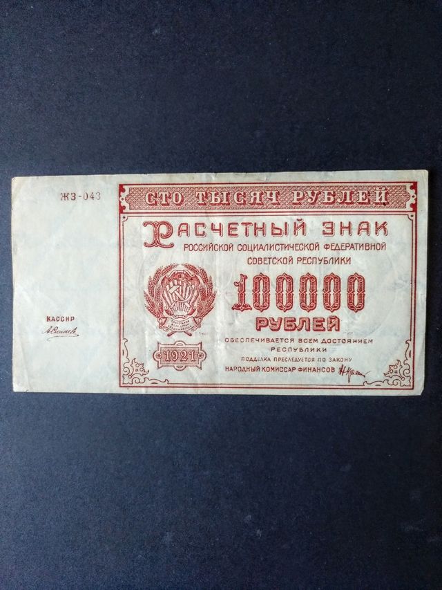 Detalles del productoAntiguo billete de 100.000 rublos de la República Socialista Federativa Soviética de Rusia (RSFSR) de 1921. Emitido por el Bando Revolucionario Comunista durante la Guerra Civil contra los Zares Rusos. Ver la clásica Hoz y Martillo del sibolo Comunista.