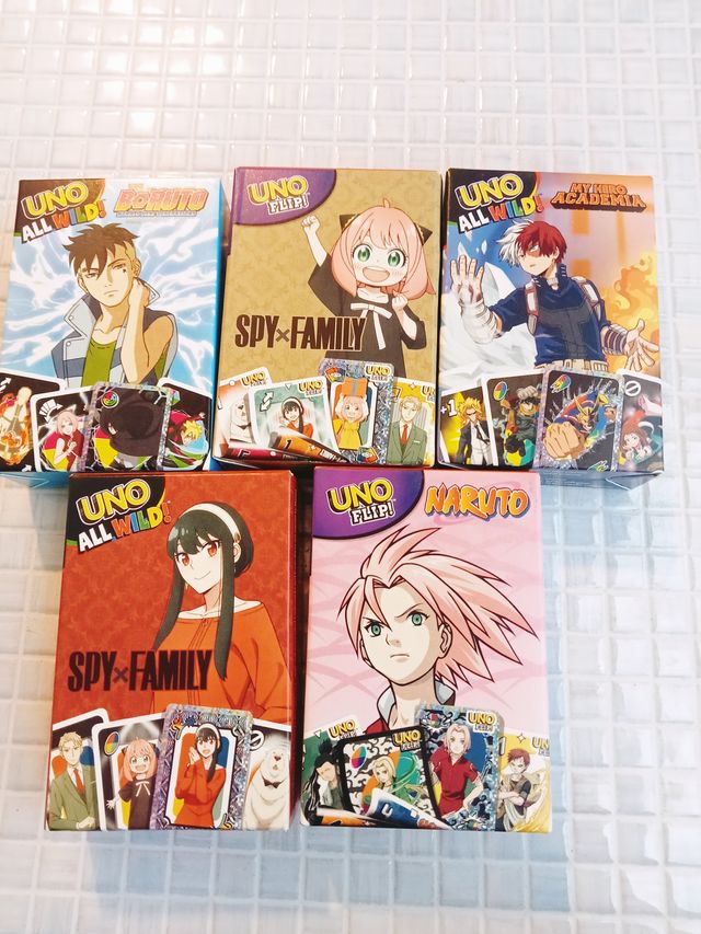 Detalles del productoColección de 5 juegos de cartas UNO temáticos de anime.