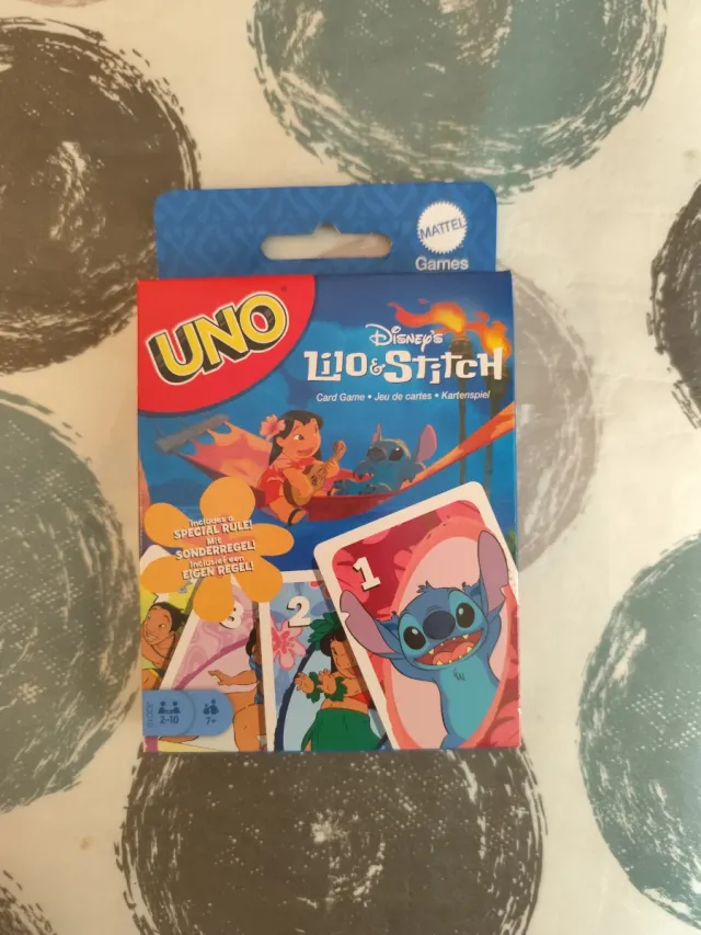 Juego de cartas UNO con temática de Disney Lilo & Stitch. Incluye una regla especial.