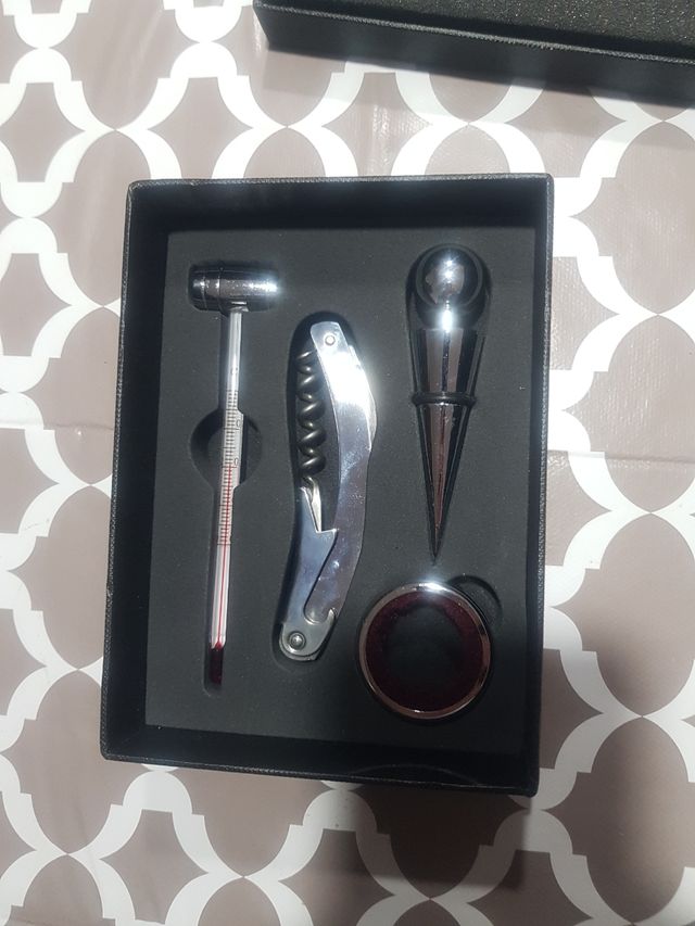 Detalles del productoUtensilios vino: termómetro, abridor, tapón y anti goteo. Nuevo, sin estrenar y caja original. Ideal regalo. Medidas del producto