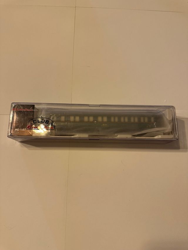 Esto es un modelo a escala H0 de un coche de pasajeros "Verderón" de Renfe.
