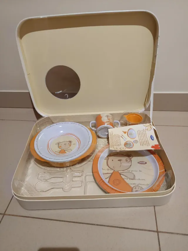 Set de vajilla para bebé de la marca Jane. Incluye varios elementos para las comidas. - Plato. - Bol. - Taza.