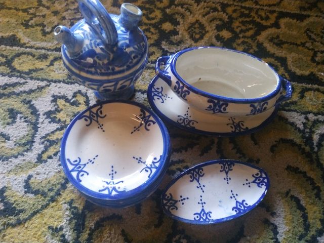 vajilla de cerámica, con juego de dos cucharas y dos tenedores cuatro platitos, y un botijo, ideal para casa de muñecas vintage