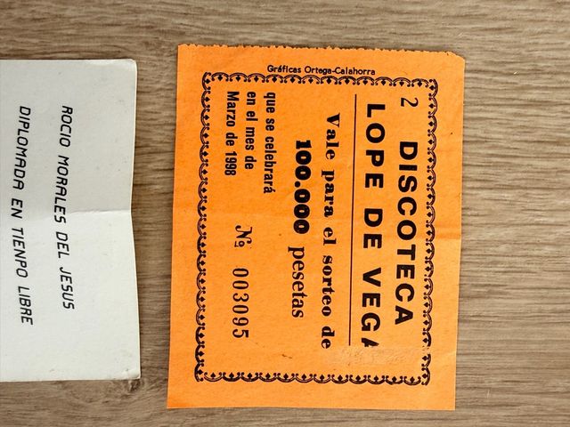 Se vende un vale original de colección para el sorteo de 100.000 pesetas de la mítica Discoteca Lope de Vega.
