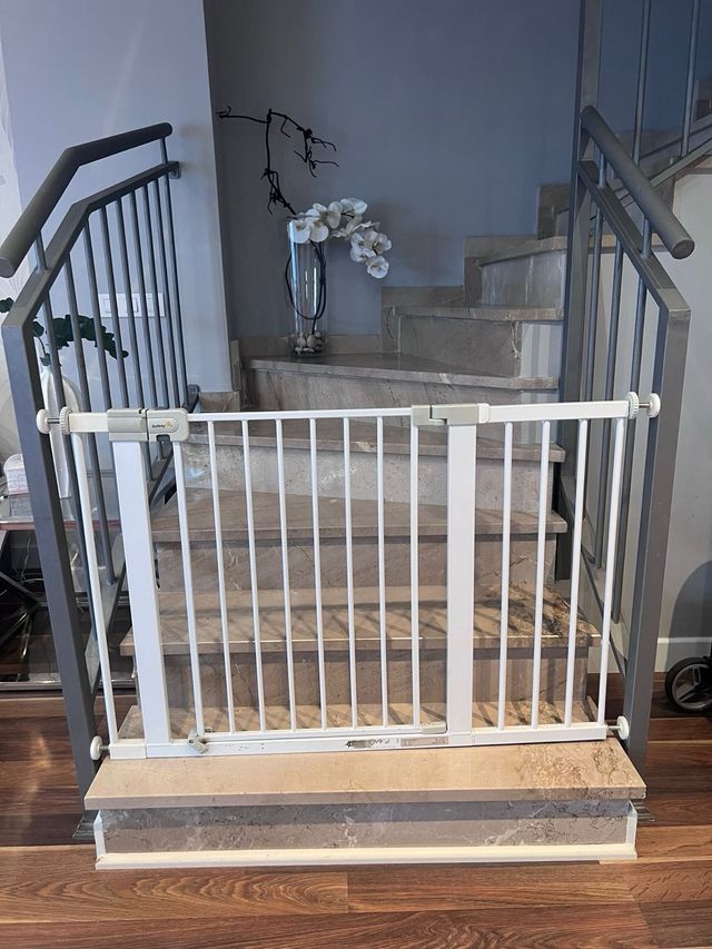 Barrera de seguridad Safety 1st, ideal para escaleras o puertas. - Color blanco. - Mecanismo de apertura y cierre. - Diseño de barrotes verticales.