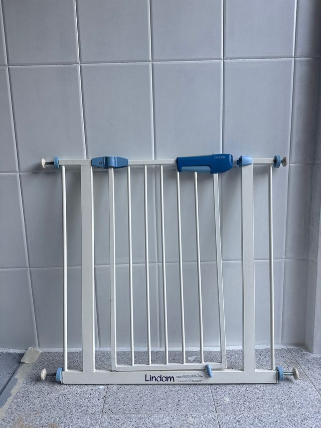 Barrera de seguridad Lindam para escaleras o puertas. - Color blanco y azul. - Mecanismo de cierre. - Ajustable.