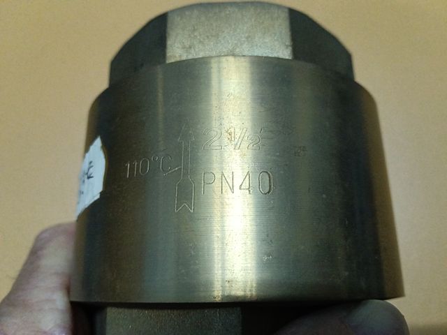 Válvula de retención de latón con marcado de 2 1/2 pulgadas y PN40. - Indicación de temperatura máxima de 110°C. - Flecha indicadora de dirección de flujo.