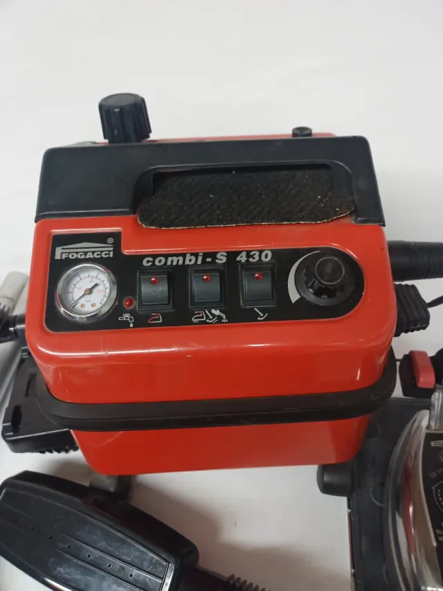Vaporeta FOGACCI Combi-S 430 en color rojo y negro. - Panel de control con interruptores y regulador. - Manómetro para control de presión. - Diseño compacto y funcional.