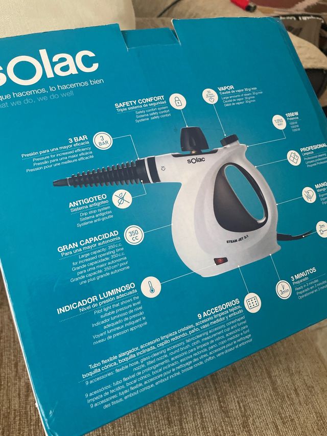 Detalles del productoVaporeta Solac en color blanco, ideal para una limpieza profunda.