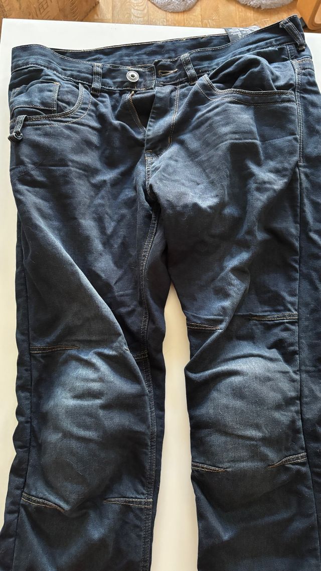 Vaquero de moto marca Course. Talla W32 L34, equivale a una L o una 42. Protecciones en cadera y rodillas, desmontables para poder lavar el pantalón. Ningun roce