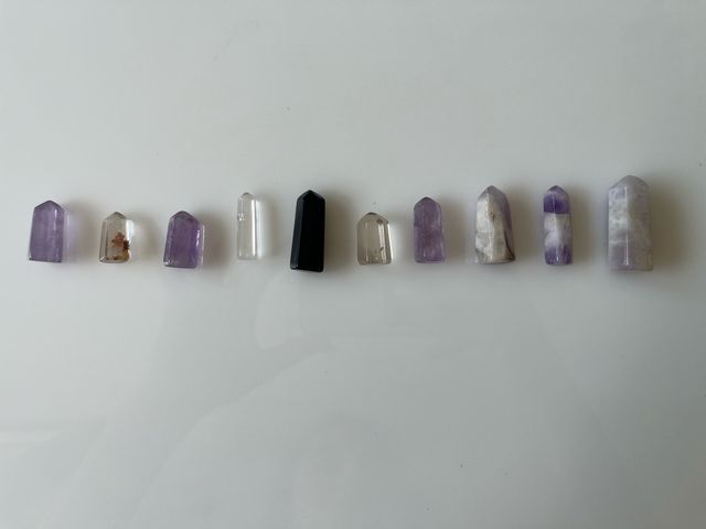 Conjunto de diez cristales puntiagudos de diferentes colores y tamaños (2,5cm/3cm). - Cristales de cuarzo, amatista, cuarzo rosa, obsidiana, cuarzo ahumado y más.