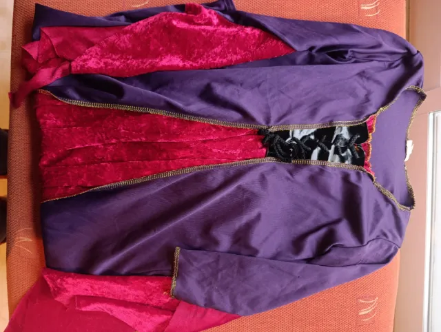 Detalles del productoVestido de disfraz para niña en tonos morado y fucsia, con detalles dorados y negros en el pecho. Ideal para fiestas o juegos.