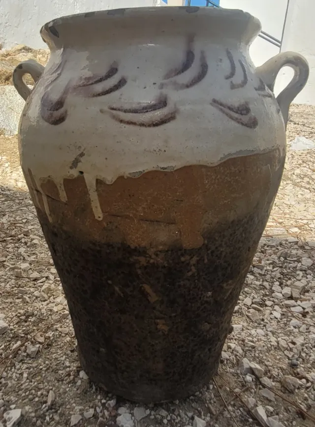 Detalles del productoVasija antigua de cerámica con un diseño rústico y un acabado artesanal. Presenta un degradado de color que va desde tonos claros en la parte superior hasta oscuros en la base. Tiene algunas muecas en la parte superior.