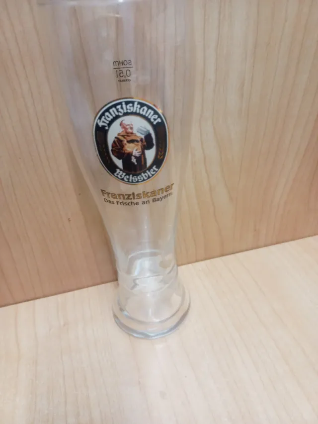 Vaso de cerveza de trigo de la marca Franziskaner. - Diseño clásico con el logo de la marca. - Capacidad de 0,5L. 25 centímetros de alto