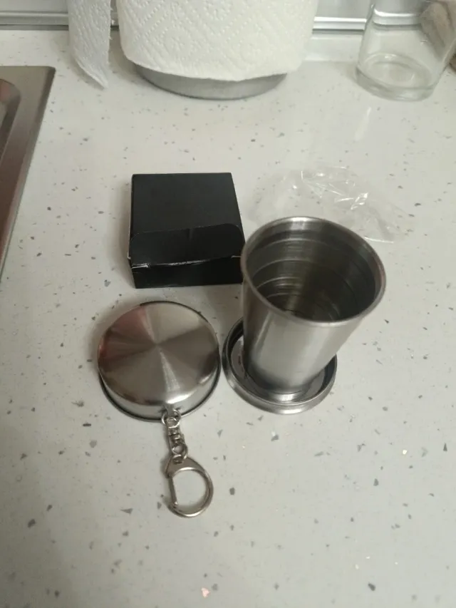 Detalles del productoPráctico vaso plegable de aluminio, ideal para llevar contigo a todas partes. Viene con un llavero para que no lo pierdas.