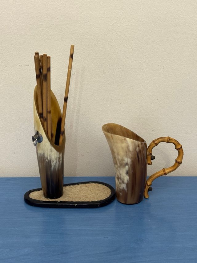 Detalles del productoConjunto artesanal de vaso y cerillas de 1962. Piezas únicas realizadas con asta de vaca/toro. Piezas artesanales compradas en Mallorca.