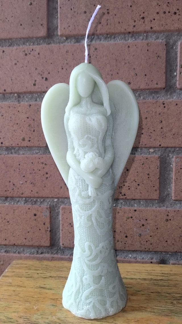 Espectacular vela que representa a una Angelita vestida de gala o de novia. Mide casi 19 cm de altura. Los detalles del vestido son preciosos.
