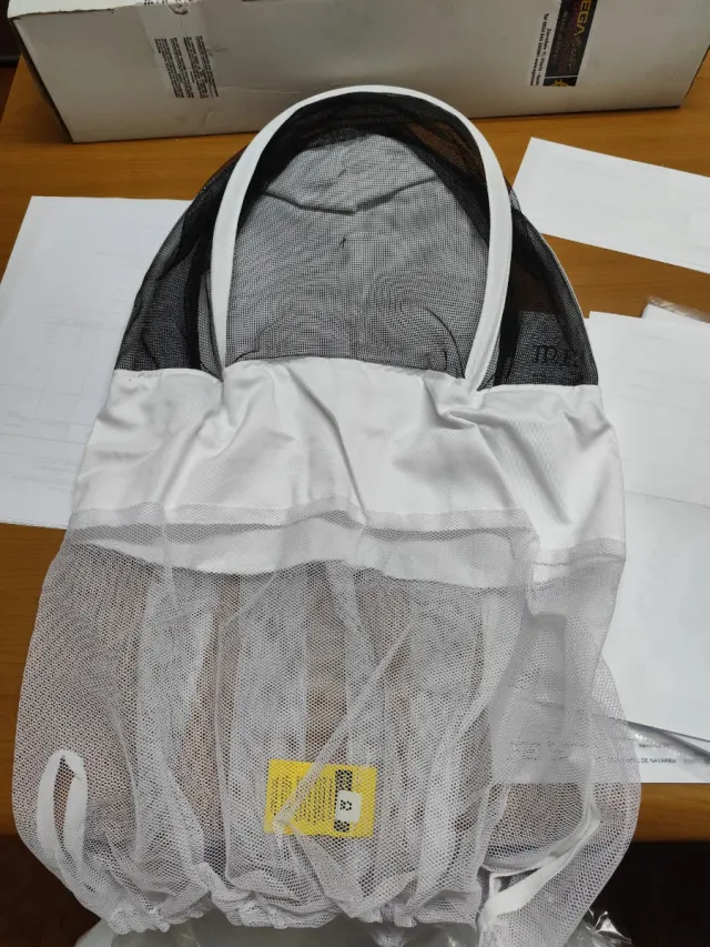 Velo de protección para apicultura. SIN USAR - Malla negra en la parte superior. - Tejido blanco en la zona del cuello. - Malla blanca en la parte inferior.