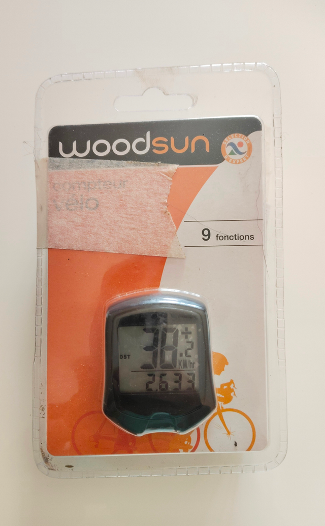 velocímetro para bicicleta de la marca Woodsun. Está nuevo y sin usar. - 9 funciones. - 2 pilas incluidas (2xCR2032). - Contador de kilómetros.