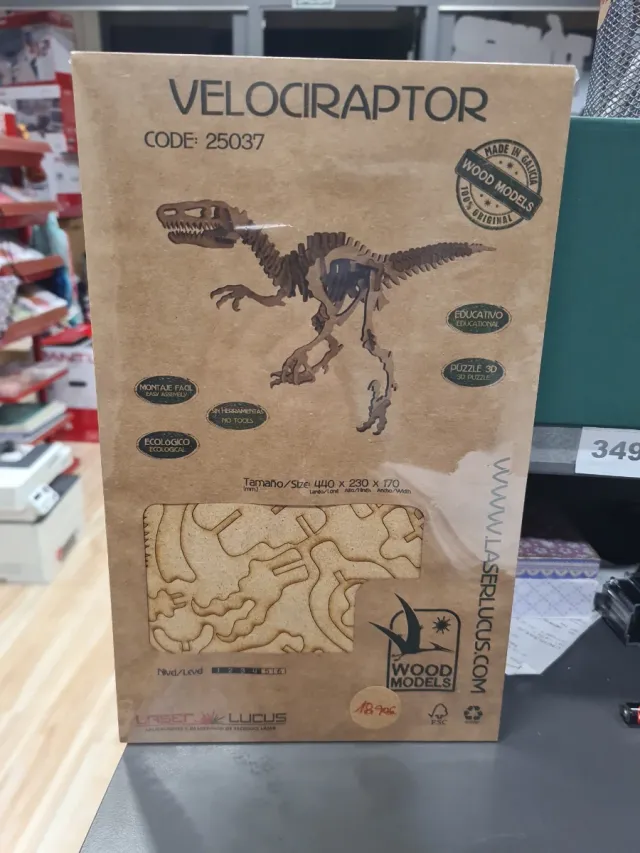 Puzzle 3D de un Velociraptor hecho de madera. - Fabricado en Galicia, España. - Modelo de madera. - Código: 25037. - Tamaño: 440 x 230 x 170 mm. - Nivel: 3.