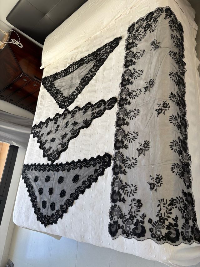 Detalles del productoConjunto de mantilla y velos antiguos (año 1940-1950)de encaje negro, ideales para complementar atuendos especiales.
