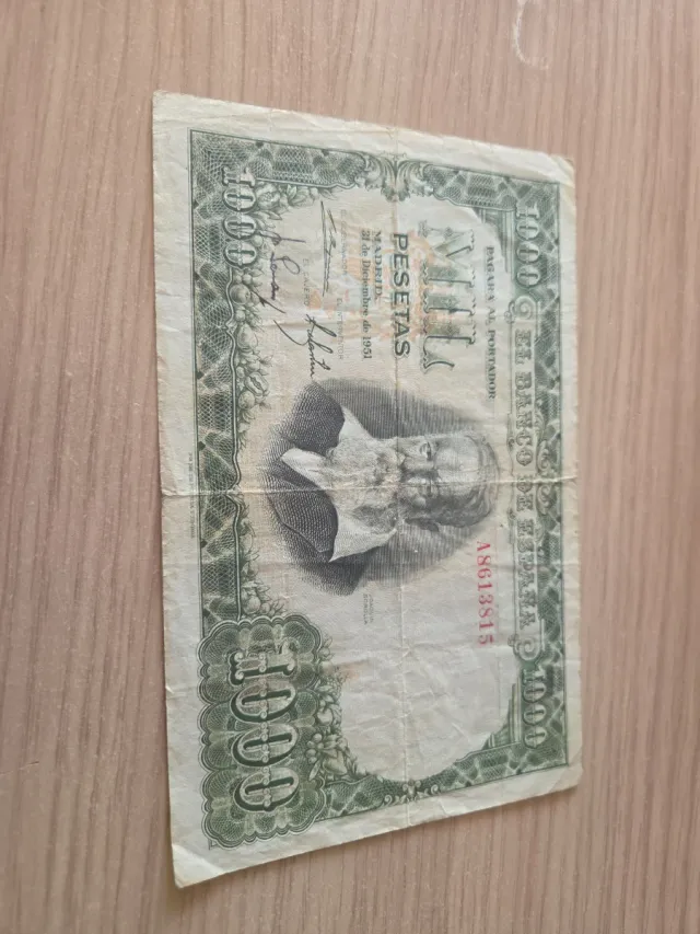 Detalles del productoBillete de 1000 pesetas del Banco de España, emitido en Madrid el 31 de diciembre de 1951.