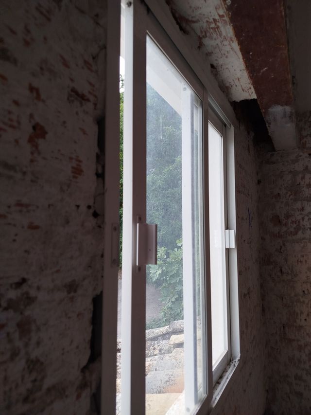 - Ventana de aluminio blanco, tipo corredera. - Con cristal transparente. - 100 alto x90 ancho cm, sin persiana, cristal básico, perfil sin RPT.