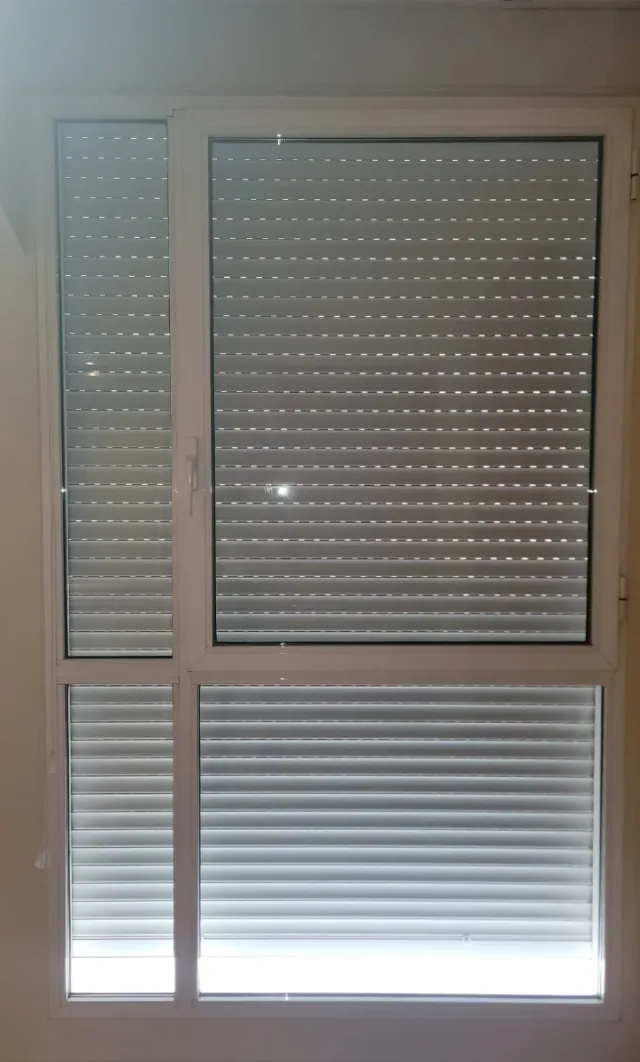Ventana de aluminio en buen estado. - Marco de aluminio blanco. - Persianas enrollables integradas.