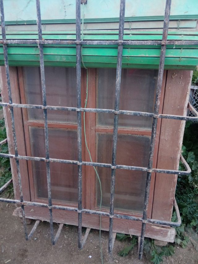 Ventana antigua con fraileros, cristales, persiana y reja de hierro fundido. Sin carcoma . alto 1,10, ancho 85, grueso 23