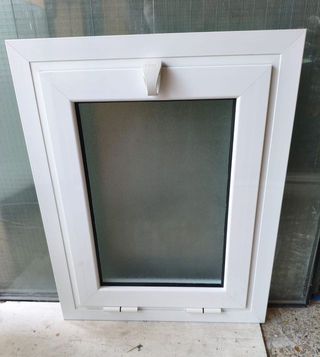 Ventana de aluminio blanco, mecanismo batiente y vidrio opaco. MEDIDAS 49 ancho X 65 alto