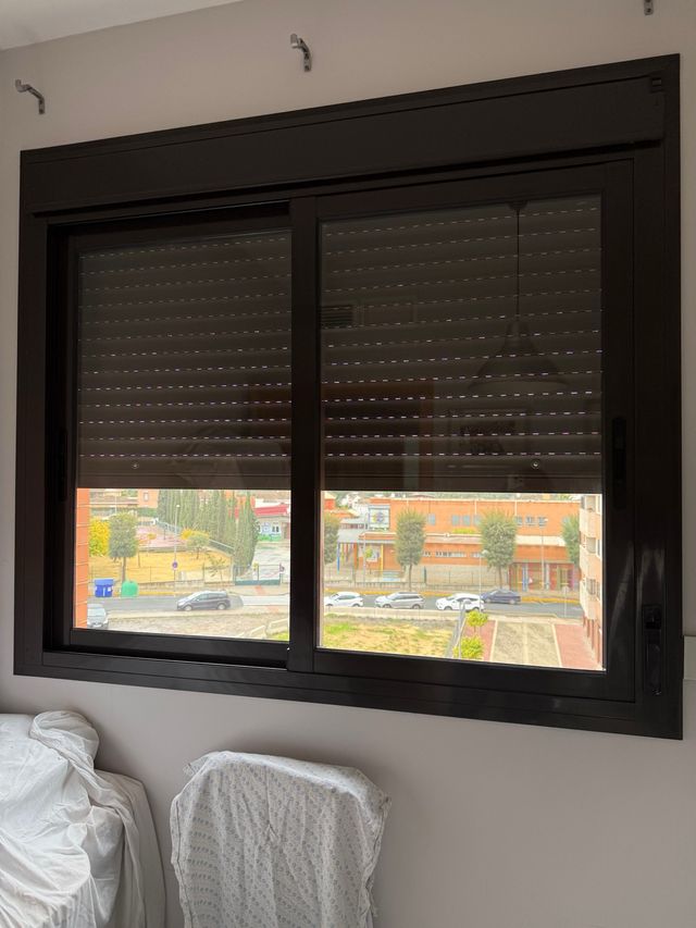 Detalles del productoVentana corredera de aluminio color marrón oscuro con climalit, persiana térmica motorizada, mosquitera corredera y tapajuntas.No incluye pulsador, precio por unidad. medidas 1’53 x 1’32 incluido cajón.