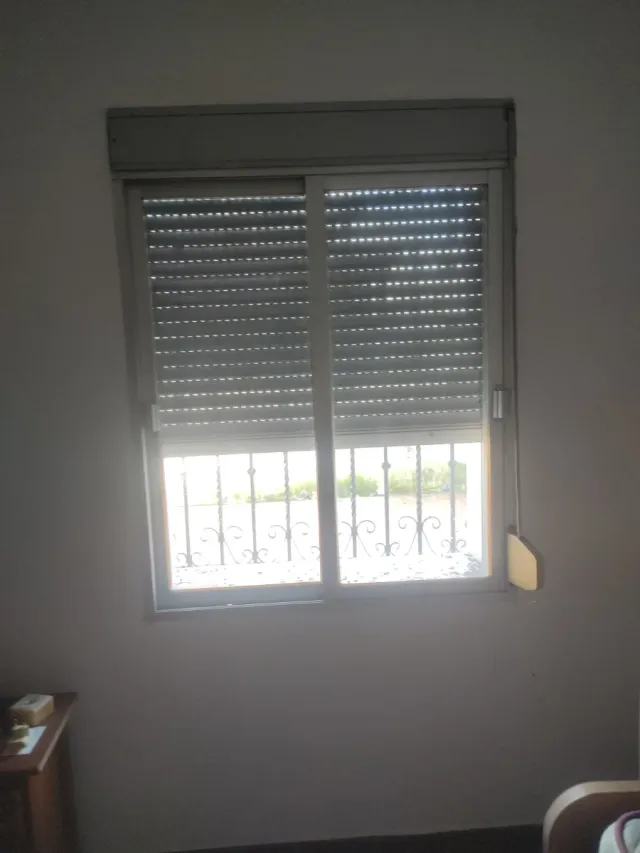 Ventana de corredera con rejas de seguridad y persiana enrollable. Hoja 50 ancho 112 alto - Marco de aluminio. - Rejas decorativas de hierro forjado.