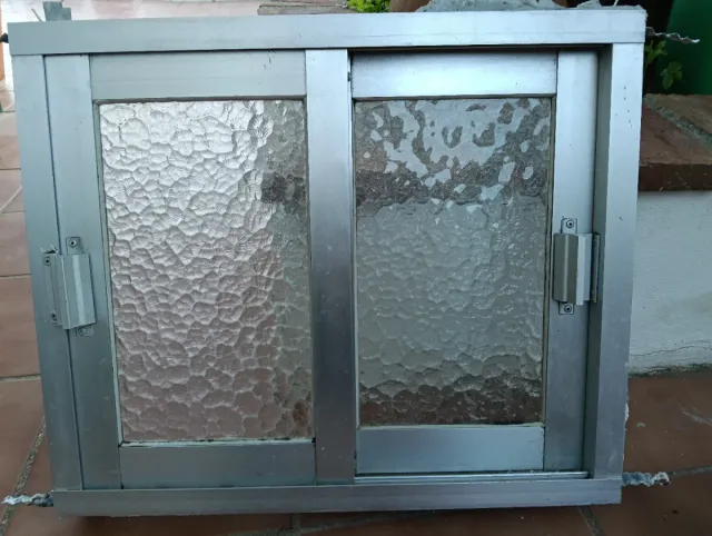 Detalles del productoVentana corredera de aluminio en color gris. Cuenta con dos paneles de vidrio texturizado. 50x60.