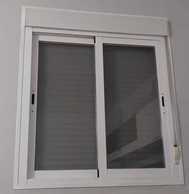 Detalles del productoVentana corredera de aluminio blanco con mosquitera integrada.