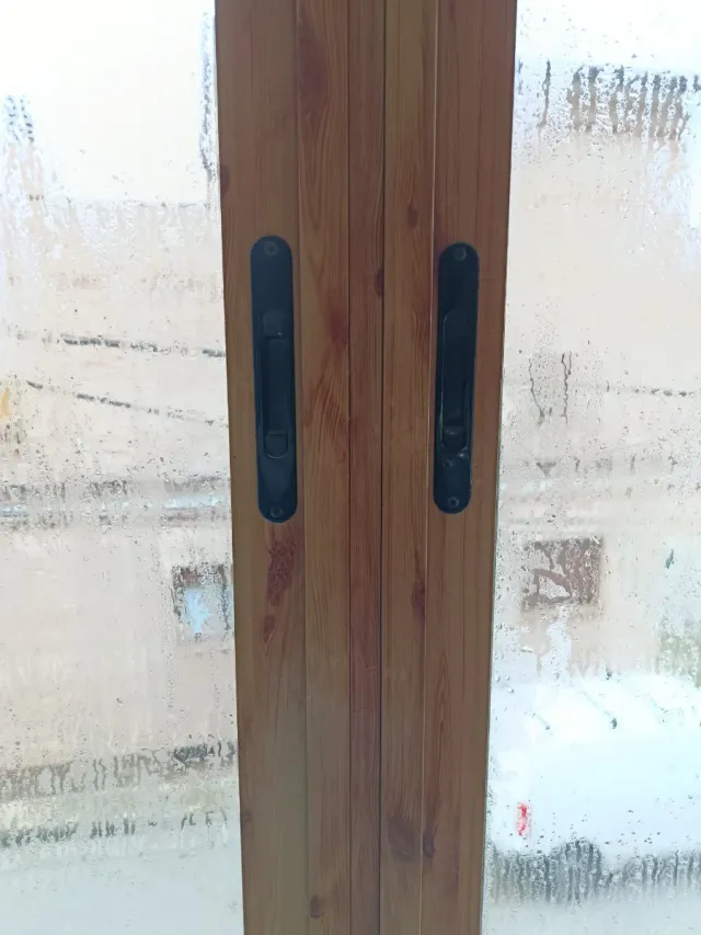 Ventana corredera con acabado que imita la madera. 265*120 - Material: PVC. - Diseño: Acabado madera.