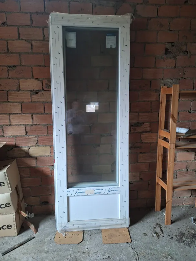 Puerta apertura exterior en color blanco esta nueva medidas 1666x 2351 sin cajon. Vidrio 4-16-4 - Marco blanco. - Cristal transparente. - Panel inferior blanco.