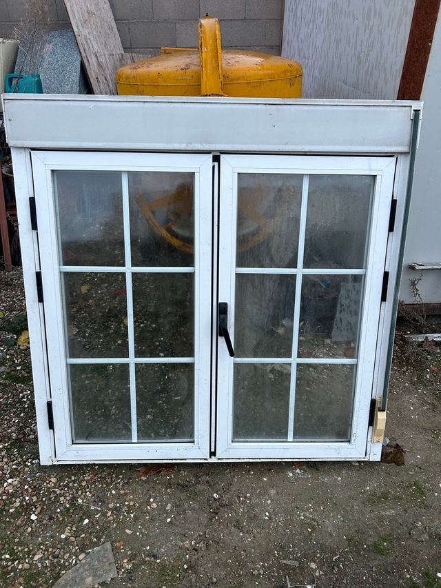 Ventana de doble hoja con marco de color blanco. Ideal para exteriores. - Marco de PVC blanco. - Doble cristal. - Diseño con divisiones. medidas: 1,24x1,10, más cajón
