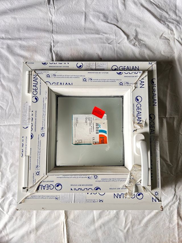 Marco de ventana GEALAN en color blanco y cristal. - Medidas: 450 x 460 mm. - Incluye manilla. - Ventana con apertura normal y abatible.