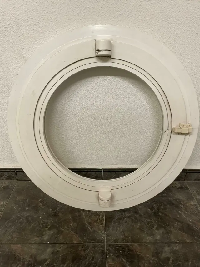 Ventana redonda estilo ojo de buey, con un diseño clásico y elegante. - Marco de color blanco. - Bisagras y cierre integrados.