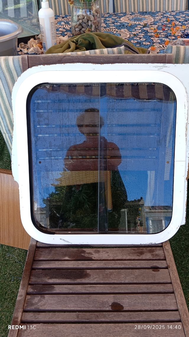 Ventana de repuesto para caravana. - Marco blanco. - Cristal tintado con lamas interiores.