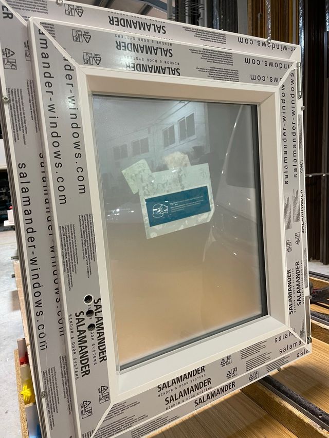 Ventana de PVC de la marca Salamander. - Marco de PVC blanco. - Cristal transparente.